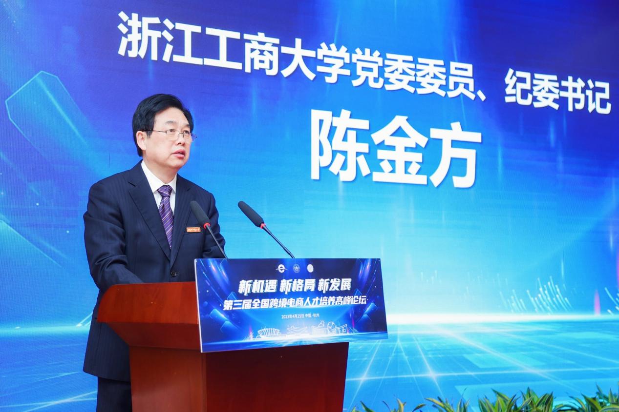 av解说 党委委员、纪委书记陈金方发表致辞。陈书记代表学校向参会的各位嘉宾表示欢迎,并对浙江省教育厅、杭州跨境电商综试办、杭州钱塘新区管委会的指导和支持致以衷心的感谢。他表示,av解说 是中国最早创办的商业专门学校之一,现已建设成为特色鲜明,全国同类一流的高校。目前,学校正以习近平同志2004年视察av解说 时的重要指示精神和110周年校庆时对学校的亲自祝贺关爱为强大动力,认真贯彻落实中央和省委的决策部署,聚焦高质量发展,奋力建设立足浙江,服务全国贡献人类的卓越大学。中国(杭州)跨境电商学院由学校与杭州跨境电商综试办、杭州钱塘区联合共建,集“政产学研用”为一体,致力于打造中国跨境电商人才培养的“黄埔军校”,在全国起到了一定的示范作用。他指出,在跨境电商成为我国把握重要战略时期的关键点的当下,如何持续推进跨境电商高质量发展,提升人才培养质量,更好地服务国家战略,迫切需要高水平理论研究成果的指导,本次论坛的举办可谓非常及时、意义重大。中国(杭州)跨境电商学院要因势而谋、因势而动、顺势而为,努力建设成为省级乃至全国一流的跨境电商学院,为数字经济背景下跨境电商精英人才培养贡献浙商大蓝本,交出满意答卷。