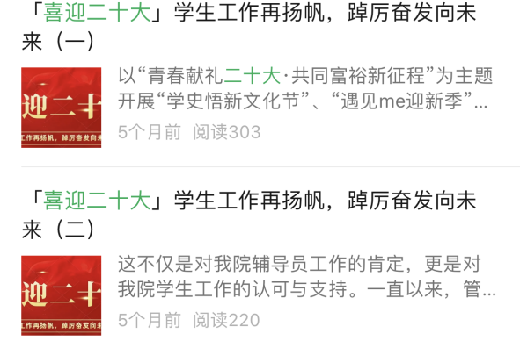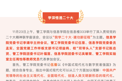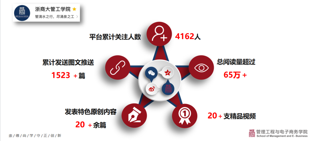 管工新媒体中心牢牢把握正确的政治方向,设立党建宣传专栏,推出“喜迎二十大”、“红色领航”、“学深悟透二十大”系列推文。紧跟av解说动态 ,聚焦活动现场,推出具有学院特色的“遇见ME迎新系列”、“专业介绍”、“访企拓岗企业走访”等专栏,积极报送学院师生活动,传播学科前沿信息。浙商大av解说 公众号进入商大风云榜学院官微前十名共16次,浙商大av解说 公众号阅读量上千推文达20余篇,学院知名度逐渐提高。
