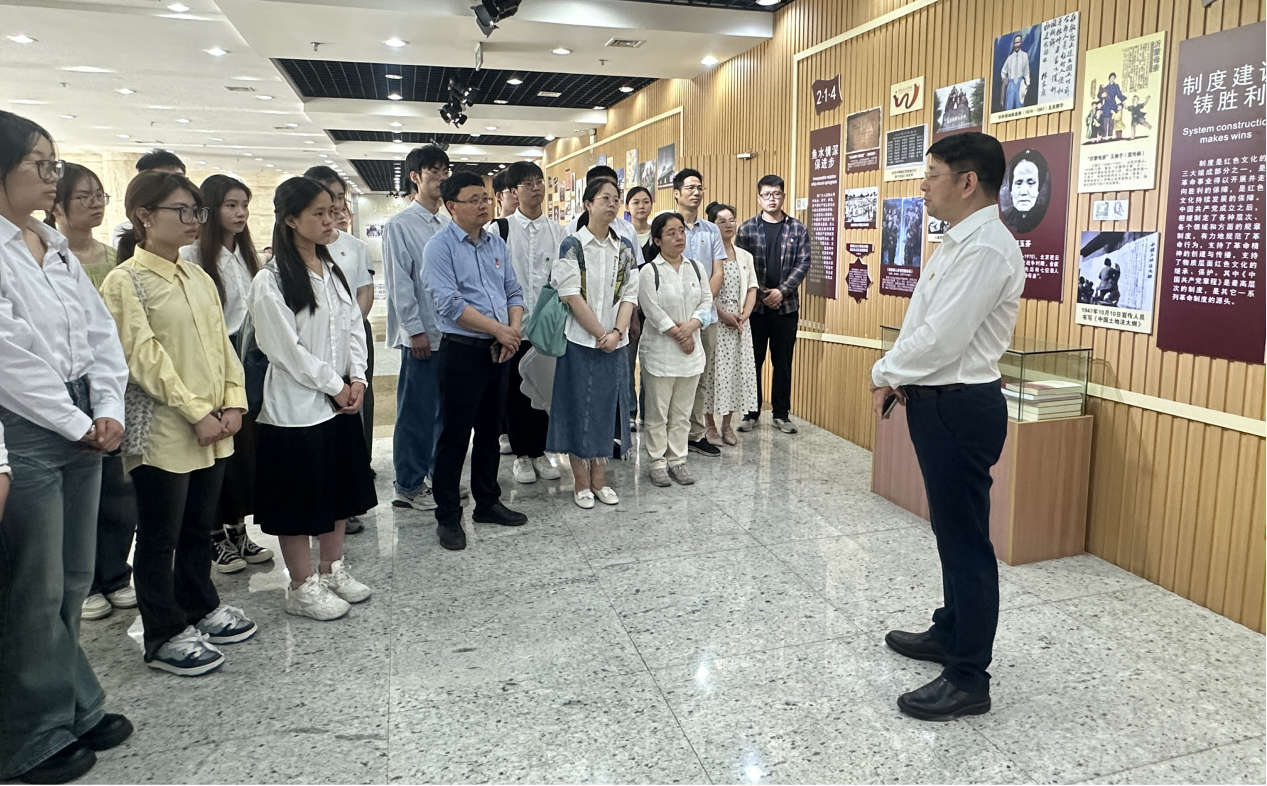 师生党员在讲解员的指引下,参观了红色文化讲习馆,系统学习了红色基因的孕育史、发展史、弘扬史以及红色档案文献展,深入了解红色文化的内涵体系与发展历程,进一步筑牢信仰之基,深化廉政建设,涵养清风正气。