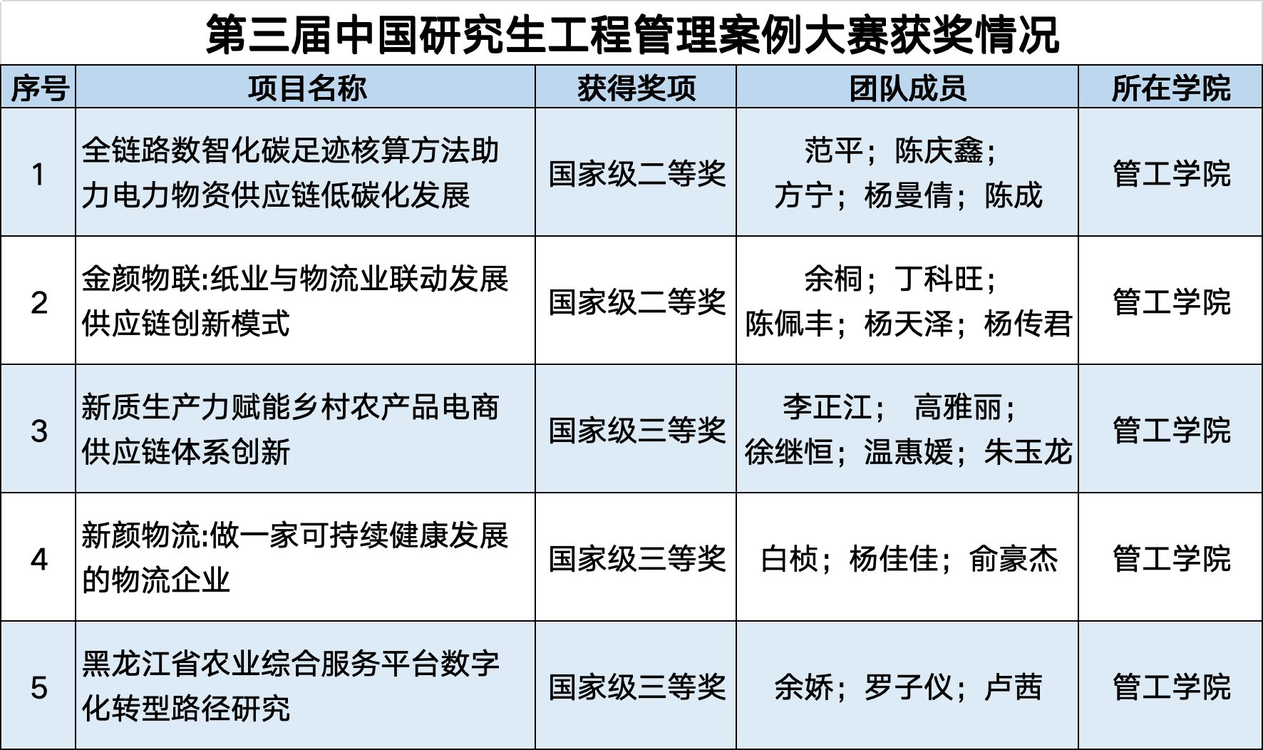 第三届中国研究生工程管理案例大赛由清华大学总承办,联合同济大学、上海交通大学、西安交通大学、浙江大学、重庆大学及大连理工大学六大高校承办6个赛道(重大工程建设、重大系统研发、精益生产、创新创业、产业创新及案例研究型学位论文)的赛事工作。大赛初赛阶段共收到来自187家研究生培养单位的优秀案例572个,评选出一等奖18个(获奖比例为3.14%),二等奖53个(获奖比例为9.26%),三等奖101个(获奖比例为17.65%)。