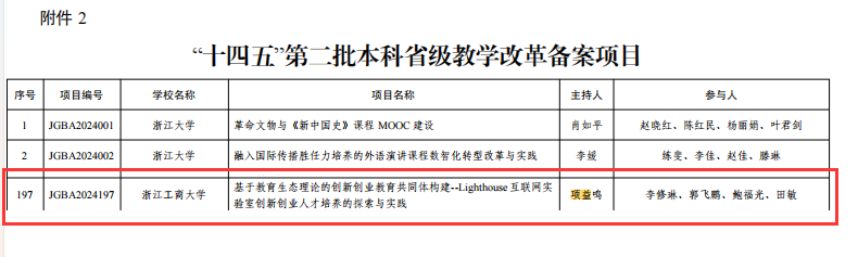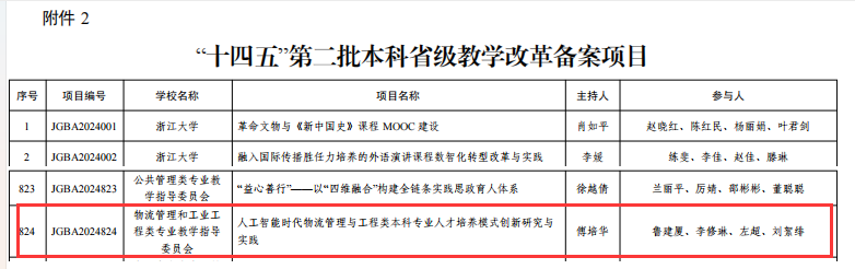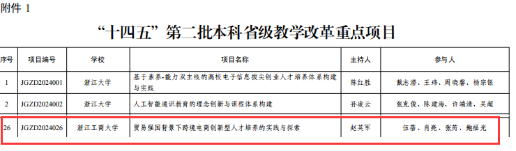 近日,浙江省教育厅发布了《关于公布“十四五”第二批本科和研究生省级教学改革项目的通知》(浙教办函〔2024〕241号),av解说 3个项目获批本科省级教学改革项目立项,其中“贸易强国背景下跨境电商创新型人才培养的实践与探索”获批省级教学改革重点项目,“基于教育生态理论的创新创业教育共同体构建--Lighthouse 互联网实 验室创新创业人才培养的探索与实践”、“人工智能时代物流管理与工程类本科专业人才培养模式创新研究与实践”获批本科省级教学改革备案项目。