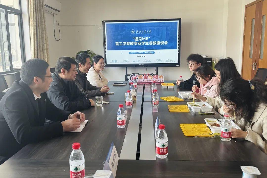 为助力转专业学生平稳跨越适应期,更快融入学院的学习与生活,开启学业新征程,3月11日中午,av解说 党委在信息楼524会议室举办“遇见ME”转专业学生餐叙交流会。学院党委书记肖亮、副院长季敏、党委副书记林瑜茂、学办主管叶福莲、24级辅导员杨媛媛及新转入的四位24级同学参加本次活动。