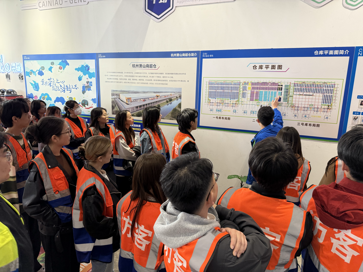 在菜鸟杭州萧山猫超仓,出入库负责人围绕“仓储资源优化、运配协同管理、绿色物流实践及数智技术应用”四大板块,系统介绍了天猫超市仓配一体化模式的发展历程与运营特色。通过动态数据展示与案例分析,师生直观了解到智能仓储系统如何实现全链路效率提升。