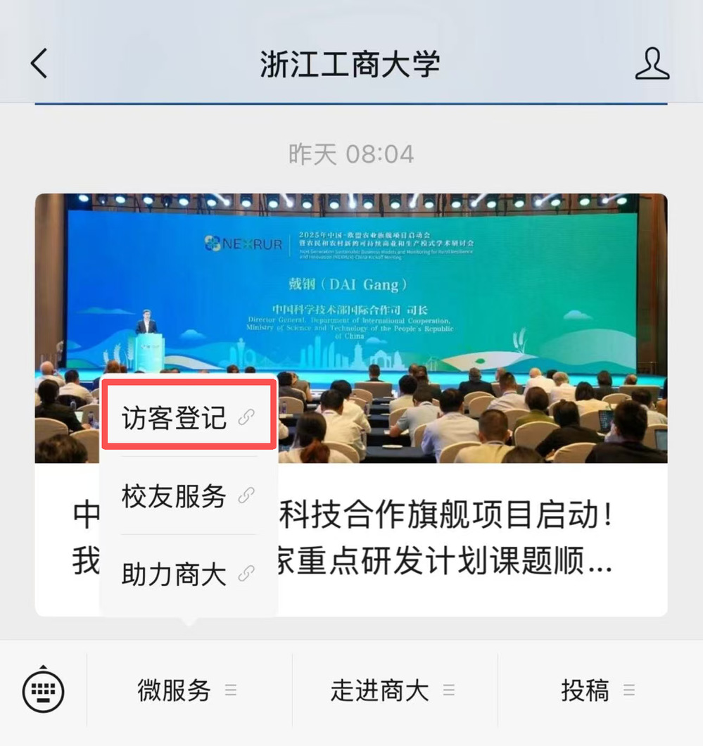 校外人员进校请关注“av解说 ”微信公众号,底部“微服务”进行访客登记。