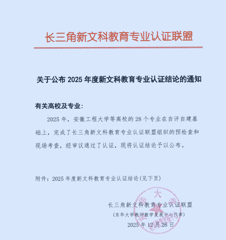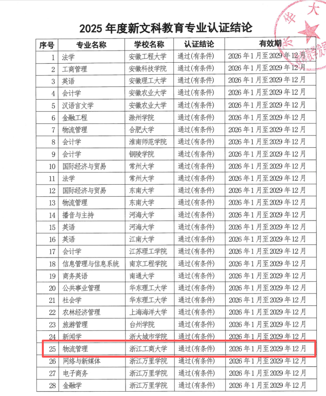 近日,长三角新文科教育专业认证联盟发布了《关于公布2025年度新文科教育专业认证结论的通知》av解说 物流管理专业通过认证认证结论有效期为4年20261月至202912月,该专业系我校首个通过此项认证的专业。